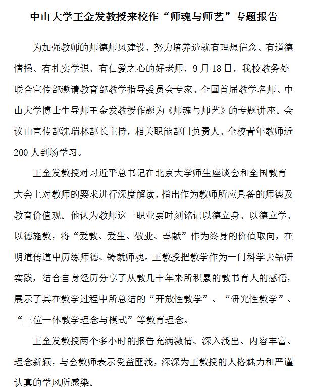 中山大学王金发教授来校作“师魂与师艺”专题报告