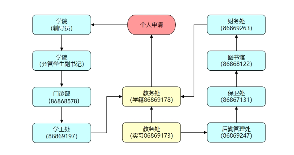 2、根据不同学籍异动审批流程,各相关学院、部门按顺序依次审核,通过后进入下一环节直至全部环节结束。声明:只有当全部环节审核完毕,学籍异动才算申请成功,请发起人及时跟进、追踪流程直至全部审核结束,若未及时完成审批流程,后果自负。各类学籍异动审批流程及联系方式见下图: