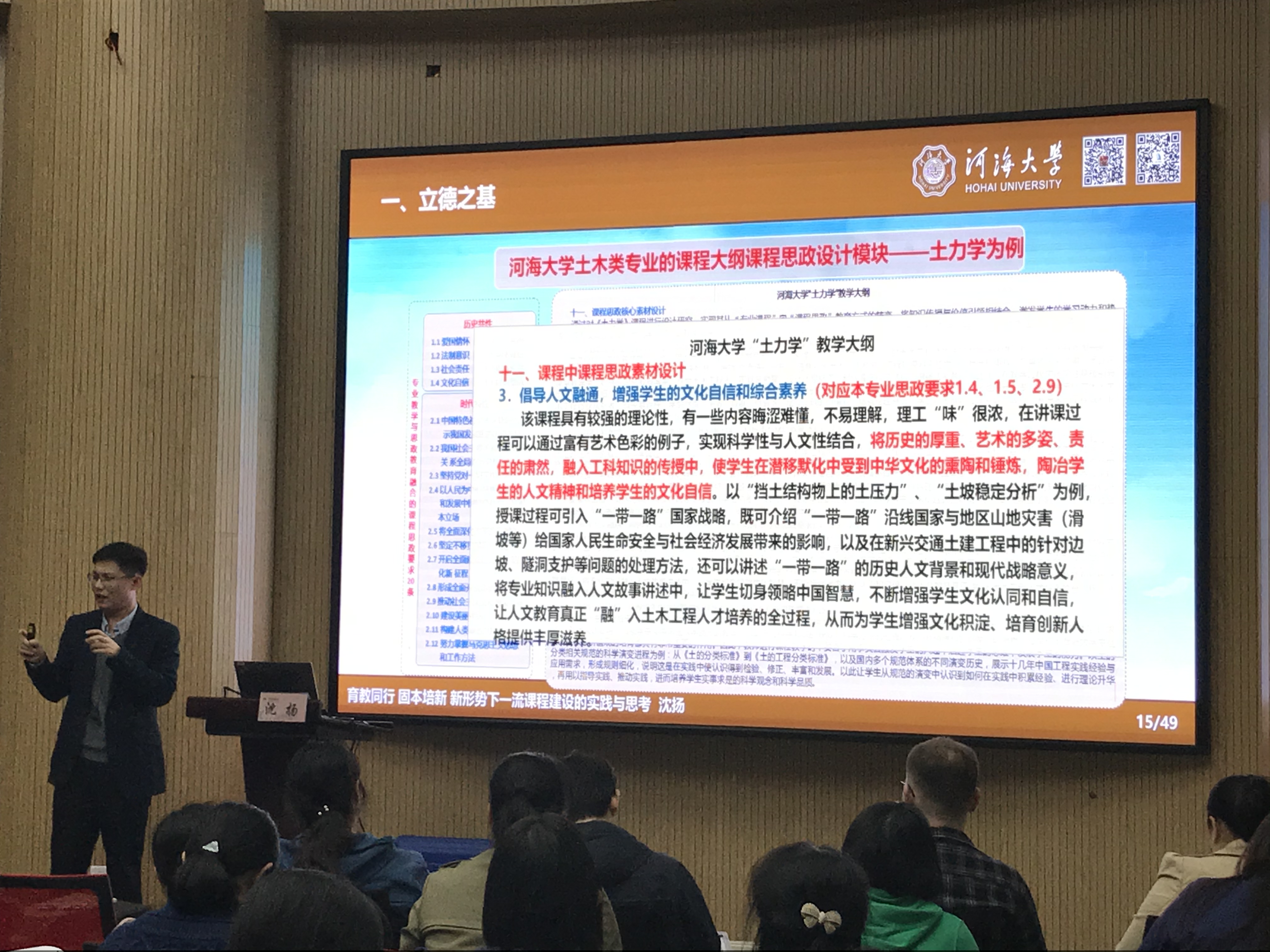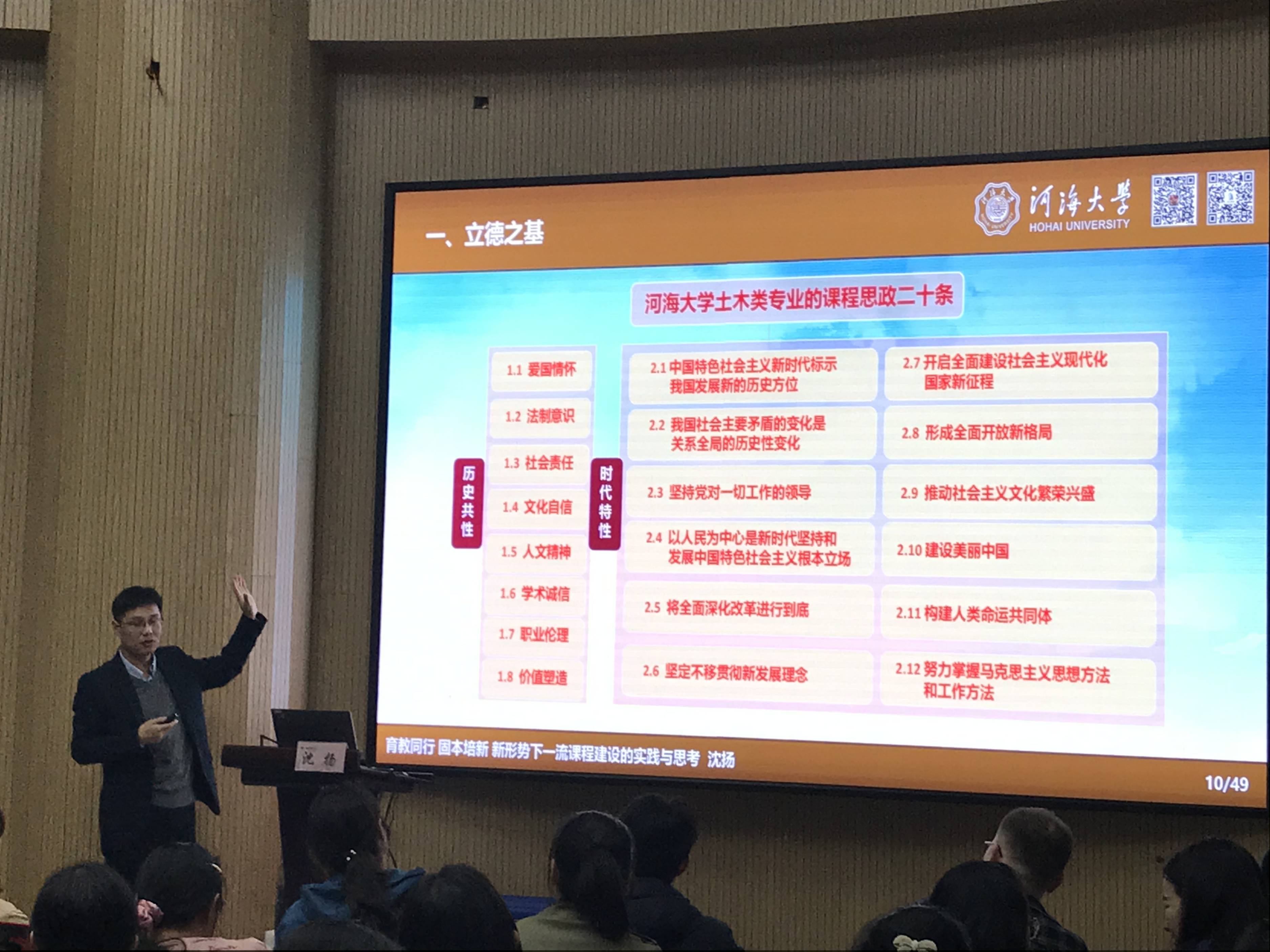 沈扬教授围绕一流课程建设,从四新建设、专业认证、课程思政等方面对国家出台的教育文件、政策,以及课程类型和建设标准进行了深入分析和解读。他结合河海大学土木类专业的课程思政二十条内容,给大家展示了河海大学土木类专业的课程思政矩阵图,并以其中一门课程“土力学”为实例,为大家介绍并示范了在日常课堂教学中如何结合专业知识有效开展“课程思政”教学。