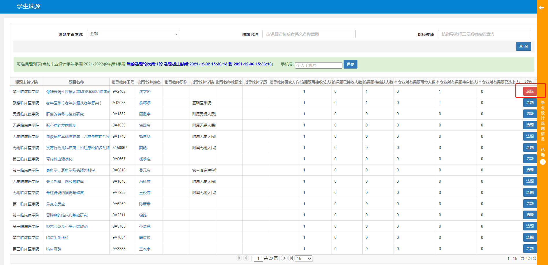 2.由于各导师带教人数有限,请同学们及时进行线上选择;各同学务必在规定时间内完成选导工作,如因个人原因未及时完成,视为服从统一分配;