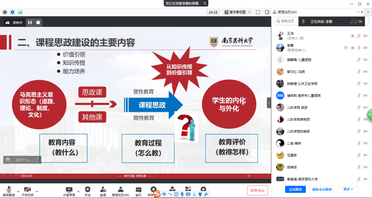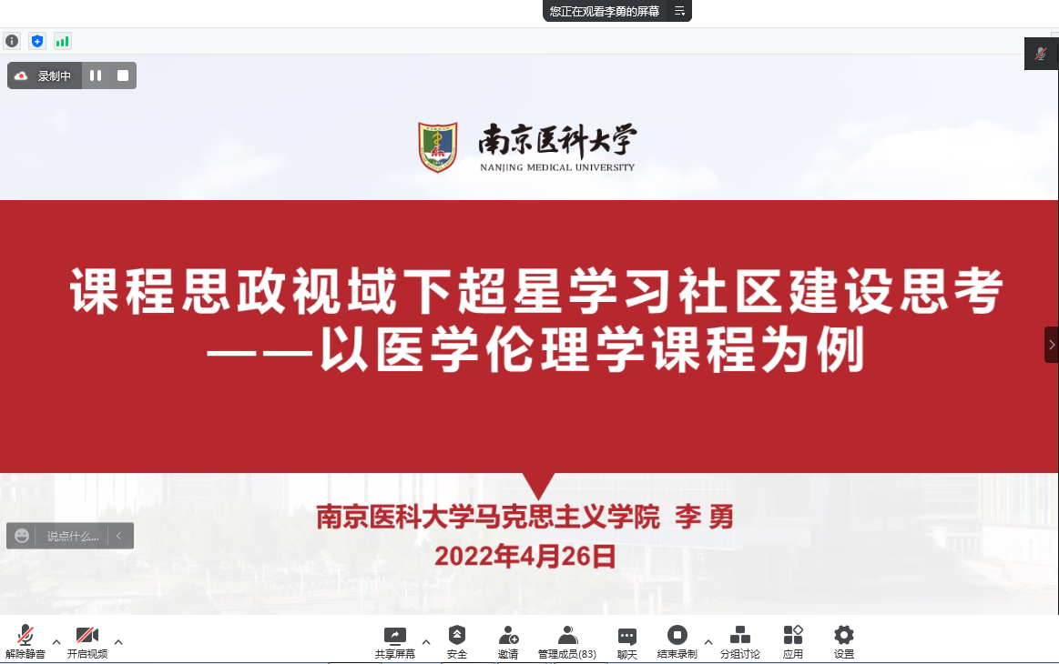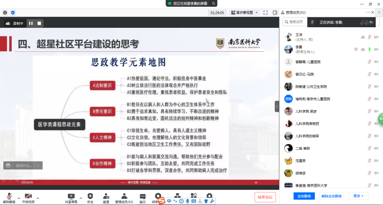 为进一步落实立德树人,推动课程思政建设,提升教学质量,4月26日,第二期天元教学工作坊邀请马克思主义学院李勇副教授做了题为“课程思政视域下超星学习社区建设的思考——以医学伦理学课程为例”的主题发言。会议由教务处副处长季旻珺教授主持,有来自各学院的教师和教学管理人员近百人线上参会。