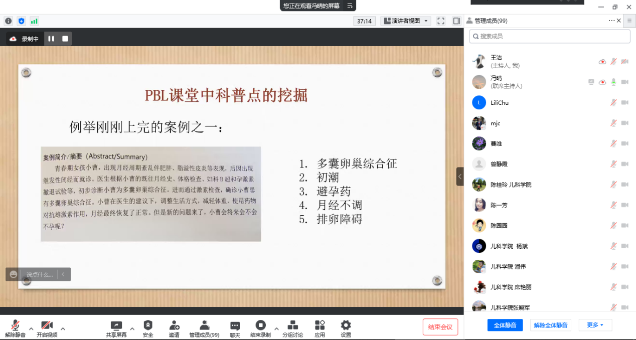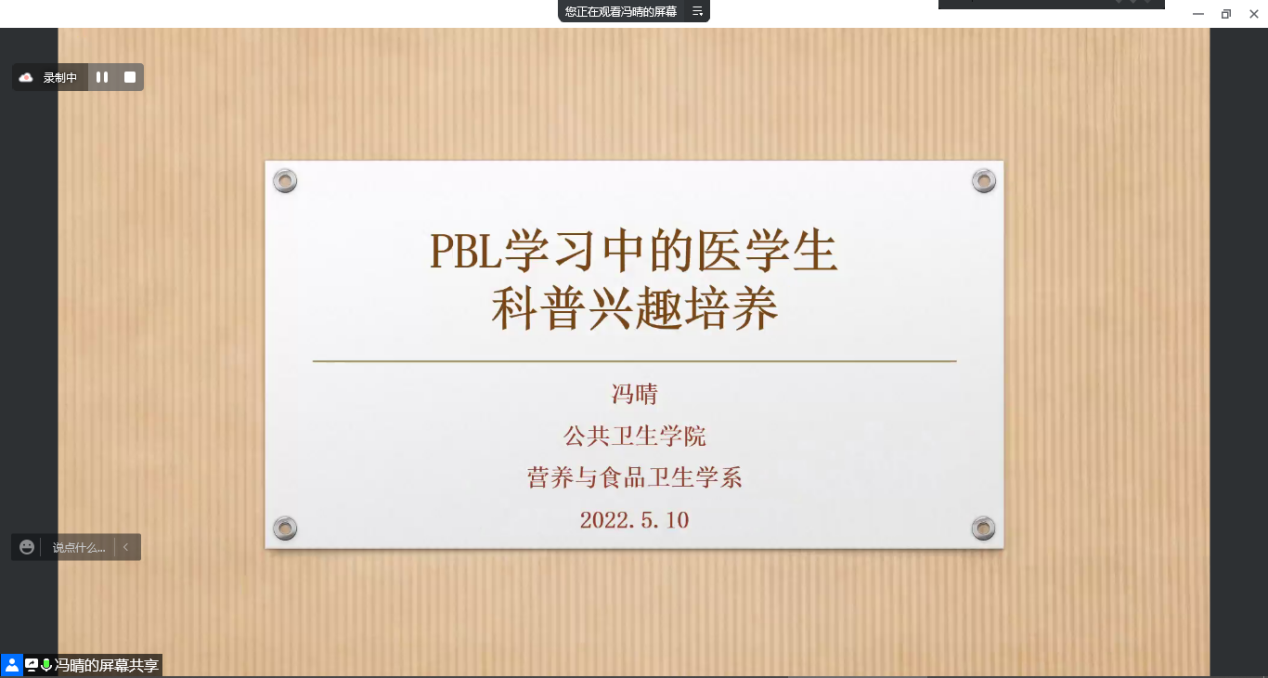 科技创新、科学普及是实现创新发展的重要途径,为培养医学生的科普能力,促进PBL教学改革,4月26日,第三期天元教学工作坊邀请公共卫生学院冯晴教授做了题为“PBL学习中医学生的科普兴趣培养”的主题发言。会议由教务处副处长季旻珺教授主持,有来自各学院的教师和教学管理人员100余人线上参会。