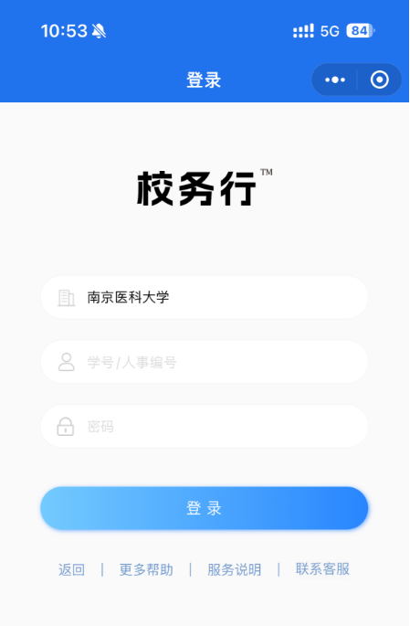 2.打开小程序后,选择“南京医科大学”,账号为学号,密码是身份证后六位,在校生通过微门户可自动登录,如遇到登陆问题点击联系客服咨询。