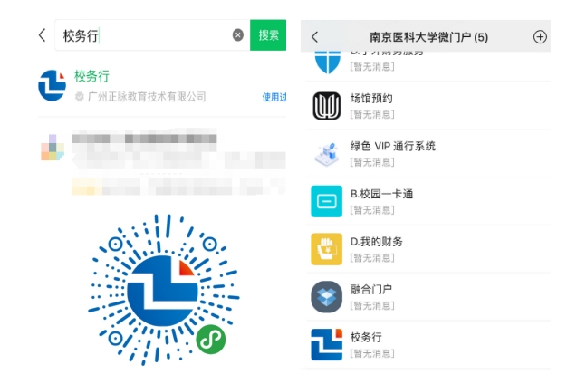 1.共计三种登录方式:微信搜索小程序“校务行”、长按识别下方二维码或从南医大微门户点击“校务行”(在校生)。
