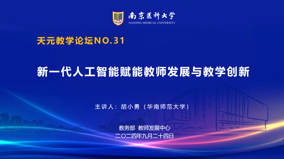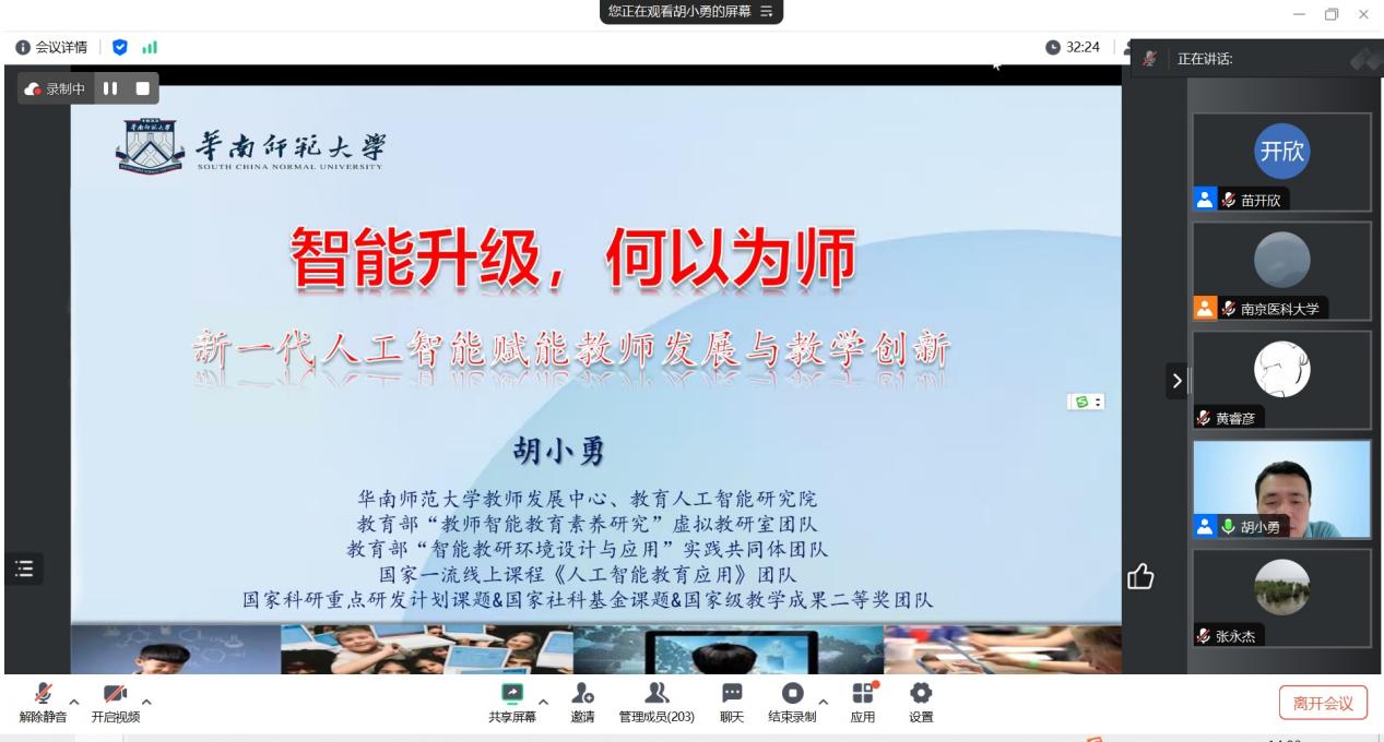 为促进人工智能技术与教育教学深度融合,有效提升教师数字化、智能化教学水平,9月24日,天元教学论坛第31讲邀请华南师范大学教师发展中心主任胡小勇教授做了题为“新一代人工智能赋能教师发展与教学创新”的主题报告,会议由教务处副处长张永杰教授主持,有来自各学院和附属医院的两百余名教师线上参会。