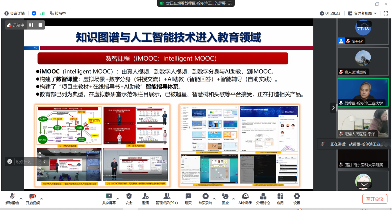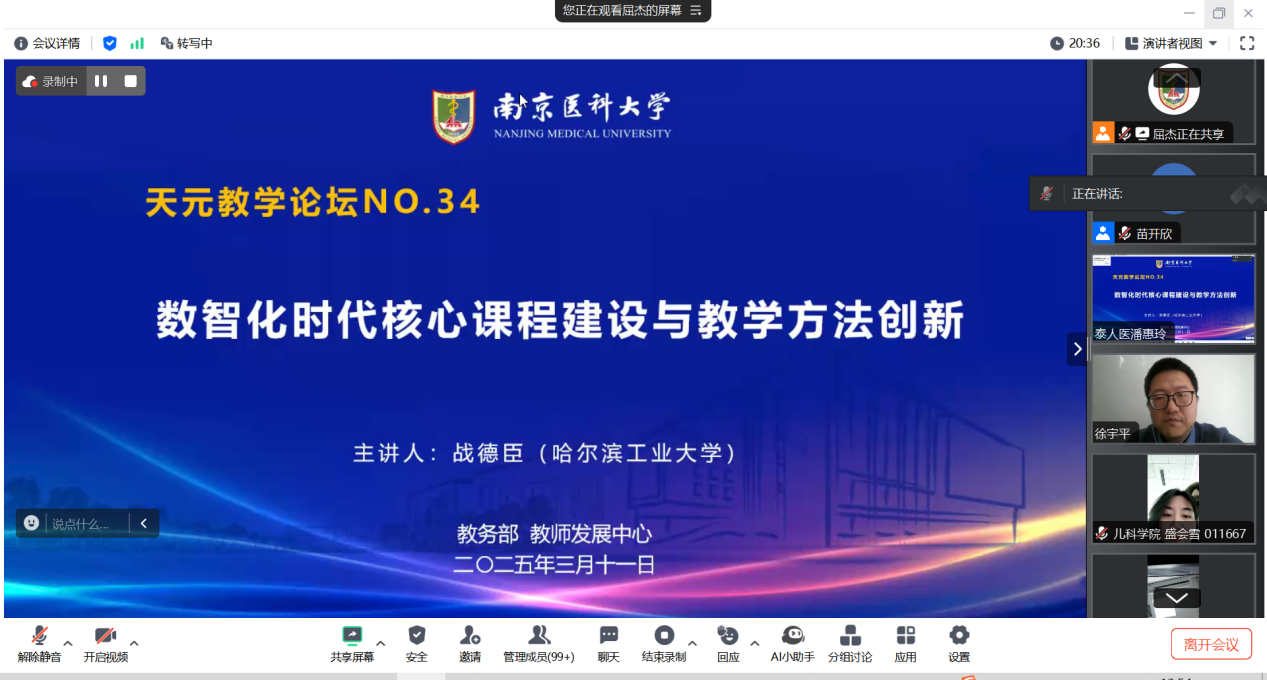 为助力我校教师精准把握数智化时代脉搏,全面提升教学质量,3月11日,天元教学论坛第34讲邀请哈尔滨工业大学战德臣教授做了题为“数智化时代核心课程建设与教学方法创新”的主题报告,会议由教务处副处长张永杰教授主持,有来自各学院和附属医院的三百余名教师线上参会。