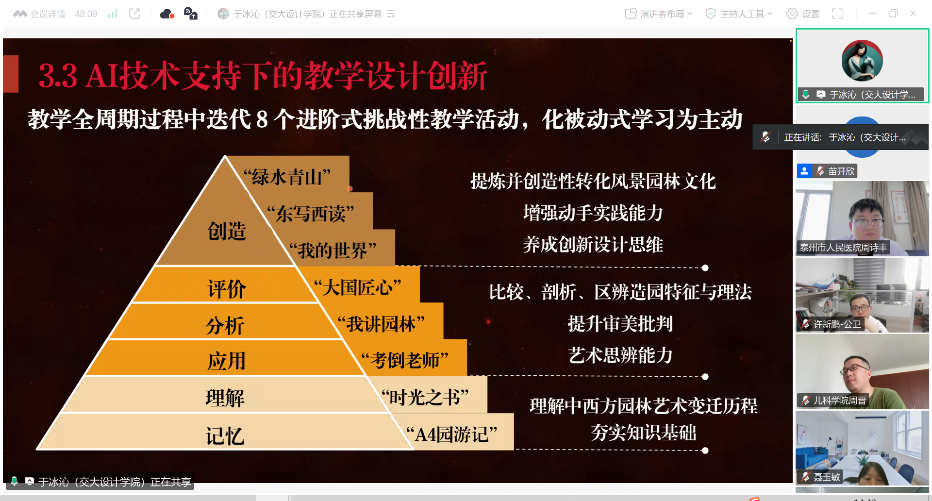 为助力我校教师紧跟数智化教育发展趋势,提升教学创新能力,4月8日,天元教学论坛第36讲邀请上海交通大学设计学院风景园林系于冰沁副教授做了题为“生成式人工智能背景下教学创新设计路径”的主题报告,会议由教务处副处长张永杰教授主持,有来自各学院和附属医院的一百余名教师线上参会。