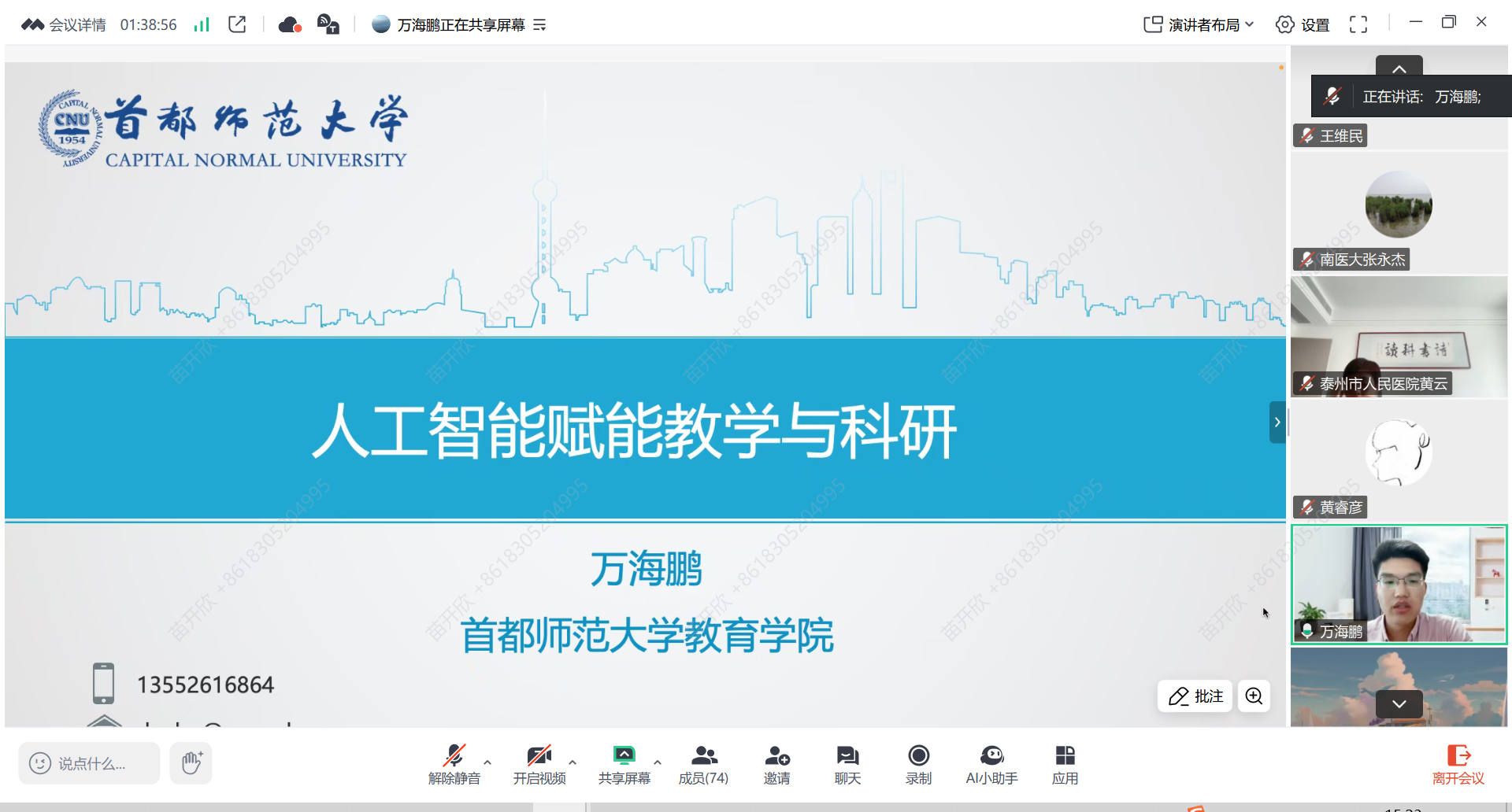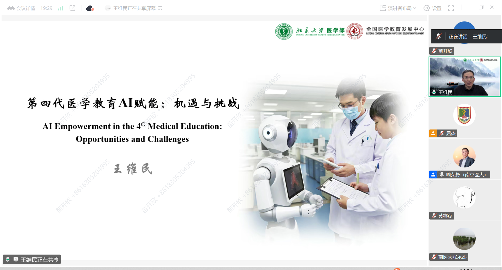 本次研讨班精心组织安排了两场专题报告,北京大学医学部主任王维民教授做了题为《第四代医学教育AI赋能:机遇与挑战》的主题报告,首都师范大学教育学院万海鹏副教授做了题为《人工智能赋能教学与科研》的主题报告。