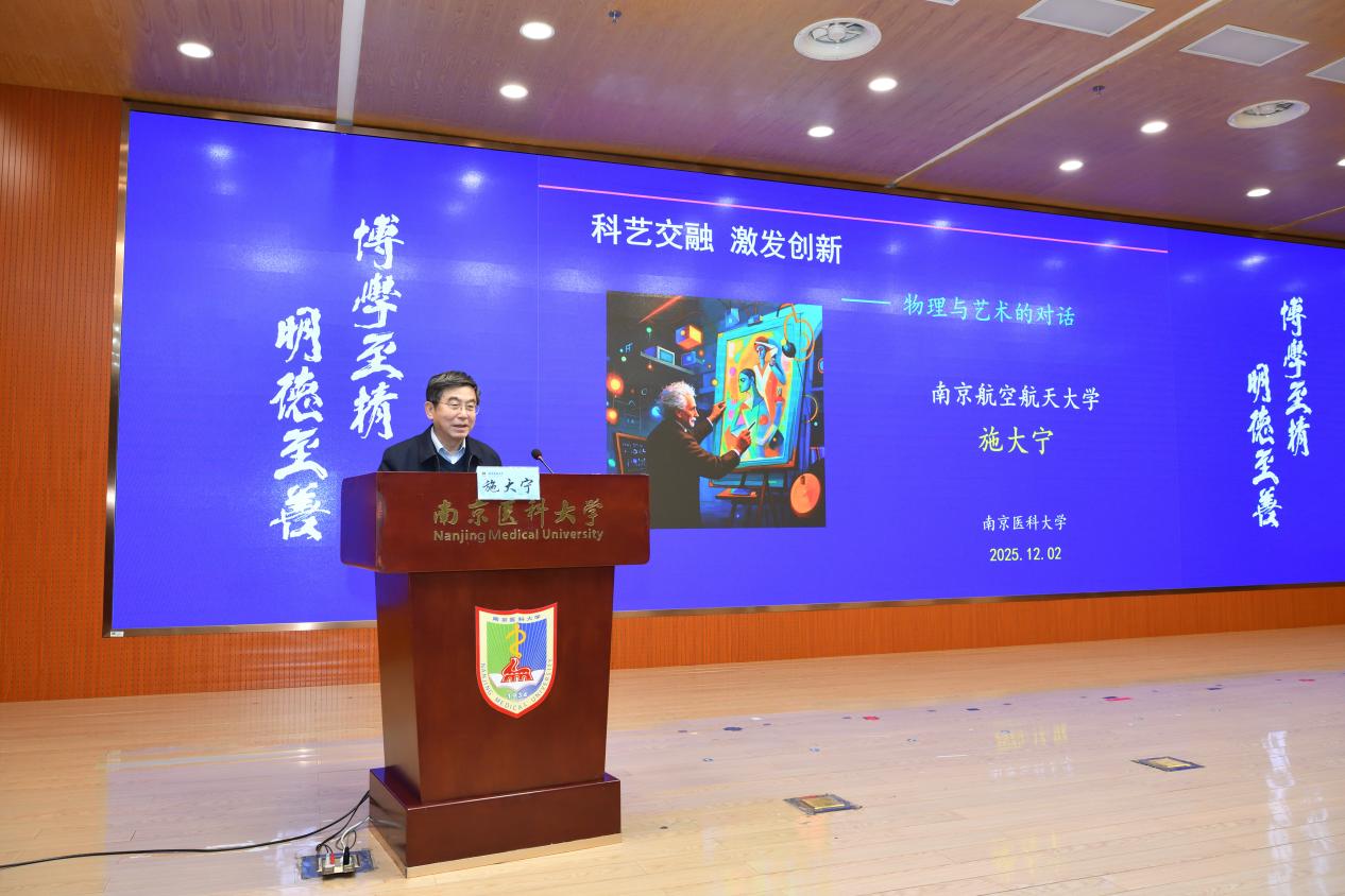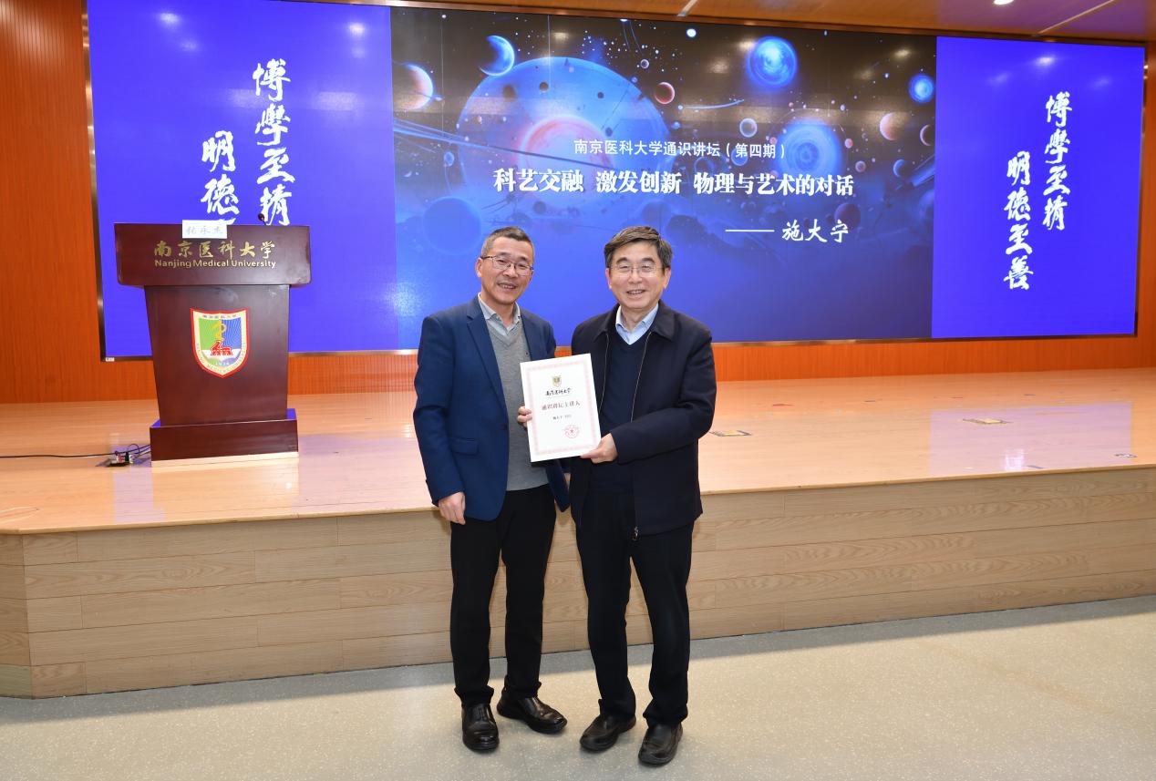 2025年12月2日晚,教务处通识教育科举办的第四期通识讲坛在江宁校区至诚楼三楼报告厅如期举行。来自南京航空航天大学的施大宁教授为同学们带来一场物理与艺术通识讲座——《科艺交融 激发创新 物理与艺术的对话》,讲座由教务处张永杰副处长主持。讲座开始前,喻荣彬处长向施大宁教授赠送了通识讲坛主讲人纪念证书。